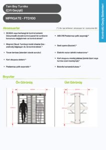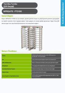 FTD100 serisi tam boy turnikeler (çift geçişli) güvenlik görevlisi olmayan ve yüksek güvenlik gerektiren yaya geçişleri için ideal bir çözümdür. Her bir geçişten sadece 1 kişinin geçişine izin verecek şekilde tasarlanmıştır. Geçiş, 3 kollu (120 derece) üçgen rotor veya 4 kollu (90 derece) kare rotor opsiyonları ile sağlanır.