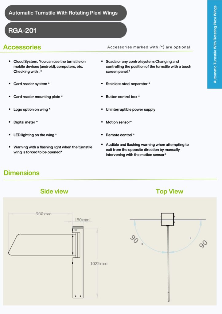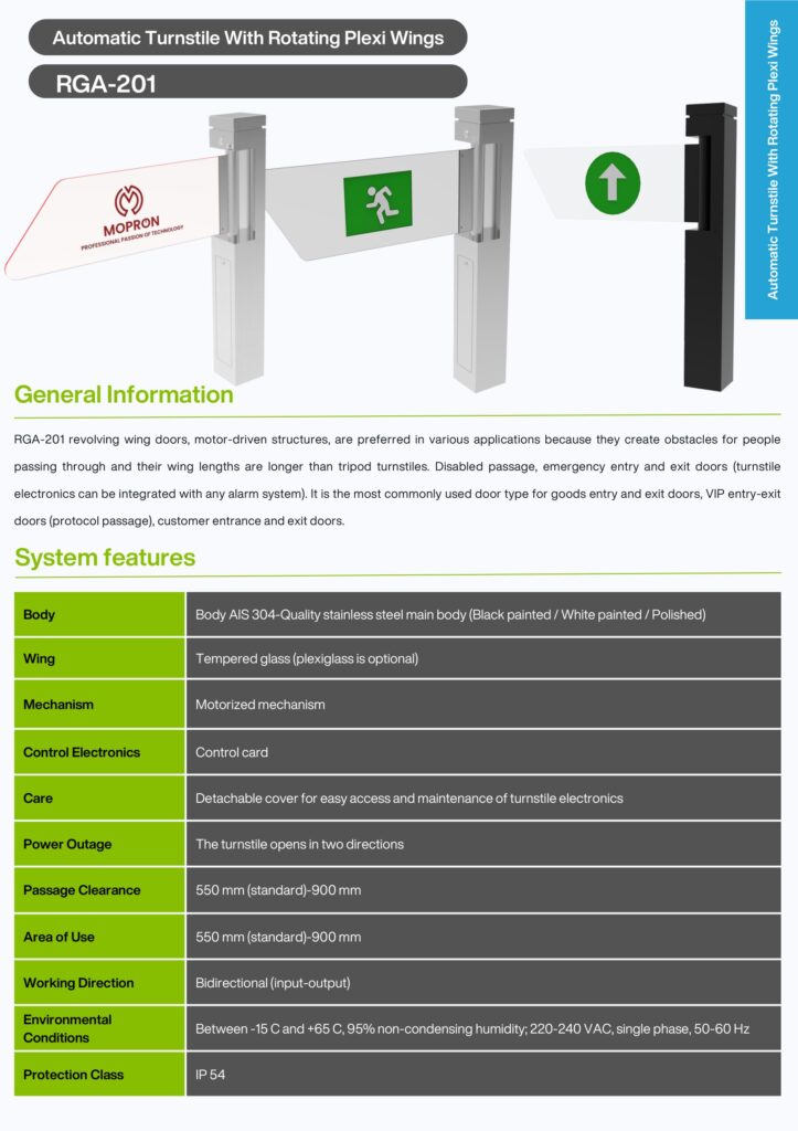 RGA-201 revolving wing gates are preferred in various applications due to their motor-driven structures, the fact that they create obstacles in front of the people who will pass and their wing lengths are longer than tripod turnstiles. It is the most widely used door type for disabled access, emergency entrance and exit doors (turnstile electronics can be integrated with any alarm system to open the wing automatically), goods entrance and exit doors, VIP entrance-exit doors (protocol passage), customer entrance and exit doors.