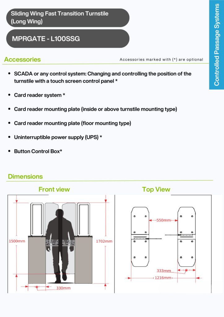 With its aesthetic appearance and effective entry-exit control, L100SSG series rapid transit turnstiles are an ideal solution for pedestrian crossings in metro/train stations where electronic fares are collected or in places such as commercial centers, stadiums, schools, government offices, private sector offices where controlled passage is required.