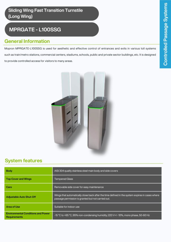 With its aesthetic appearance and effective entry-exit control, L100SSG series rapid transit turnstiles are an ideal solution for pedestrian crossings in metro/train stations where electronic fares are collected or in places such as commercial centers, stadiums, schools, government offices, private sector offices where controlled passage is required.